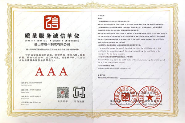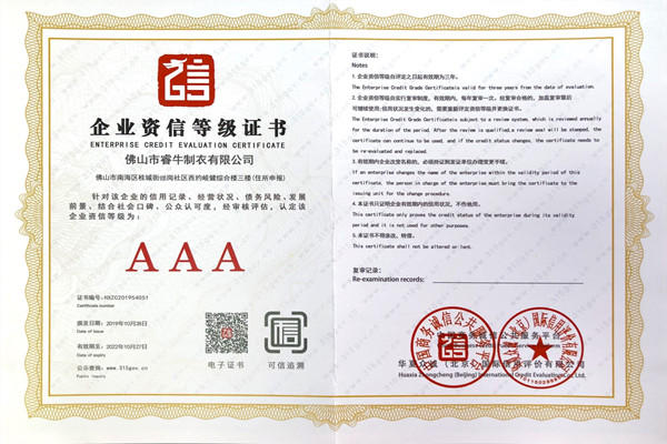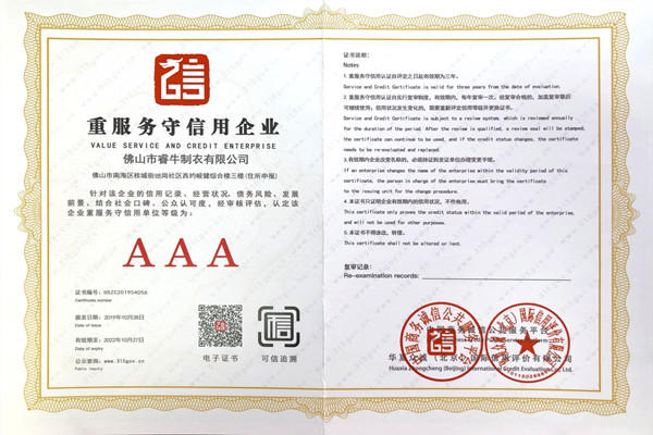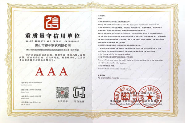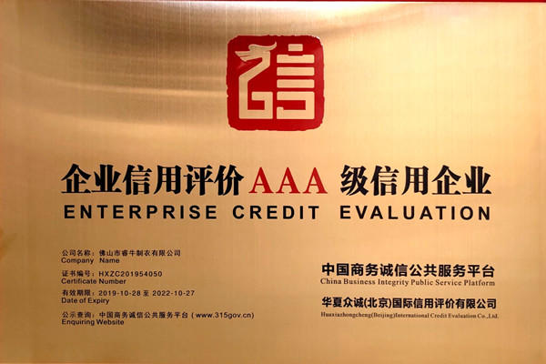佛山市睿牛制衣有限公司——3A級質(zhì)量服務誠信單位;