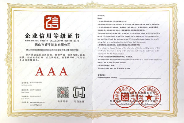 佛山市睿牛制衣有限公司——3A級企業(yè)資信等級證書;