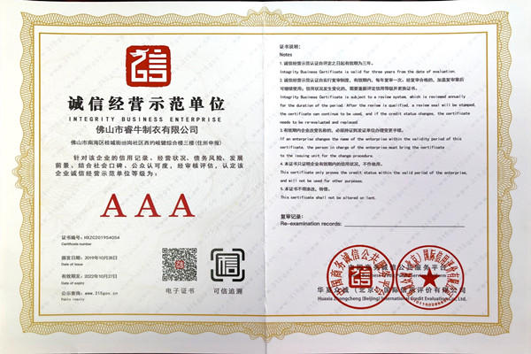 佛山市睿牛制衣有限公司——3A級誠信經(jīng)營示范單位;