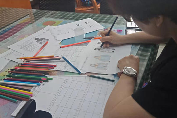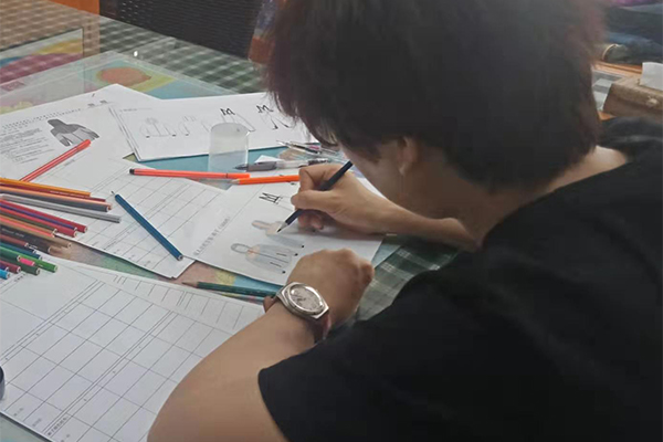 盡管困難重重,我們也要想進(jìn)一切辦法做到,不僅要做好,而且要做到最好!我們的總經(jīng)理自己也搖身一變?cè)O(shè)計(jì)師——畫(huà)稿,可以看到以下的圖片,認(rèn)真、負(fù)責(zé)的態(tài)度,用心的為客戶所思,一筆一筆的畫(huà)好,一點(diǎn)點(diǎn)的涂好顏色;還有一個(gè)紙樣哥哥也在幫忙畫(huà),他們兩個(gè)人在一兩天的時(shí)間內(nèi)要畫(huà)好接近10個(gè)款衣服和褲子,雖然我們的時(shí)間不多,但是睿牛的小伙伴們也是很努力的去做,努力過(guò)就不曾后悔。