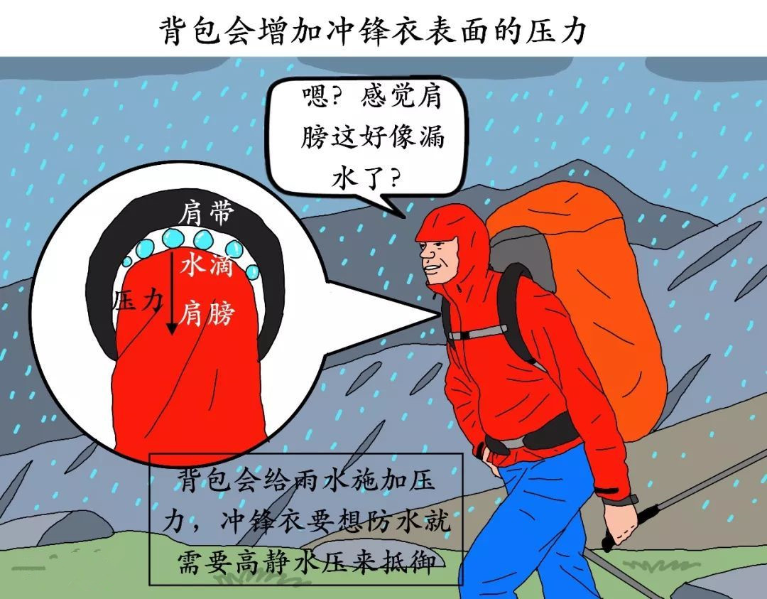 所以,雨越大,沖鋒衣需要的靜水壓越高。而來自背包、身體等壓力,會讓沖鋒衣的靜水壓需求更進一步。