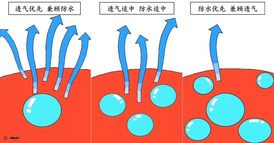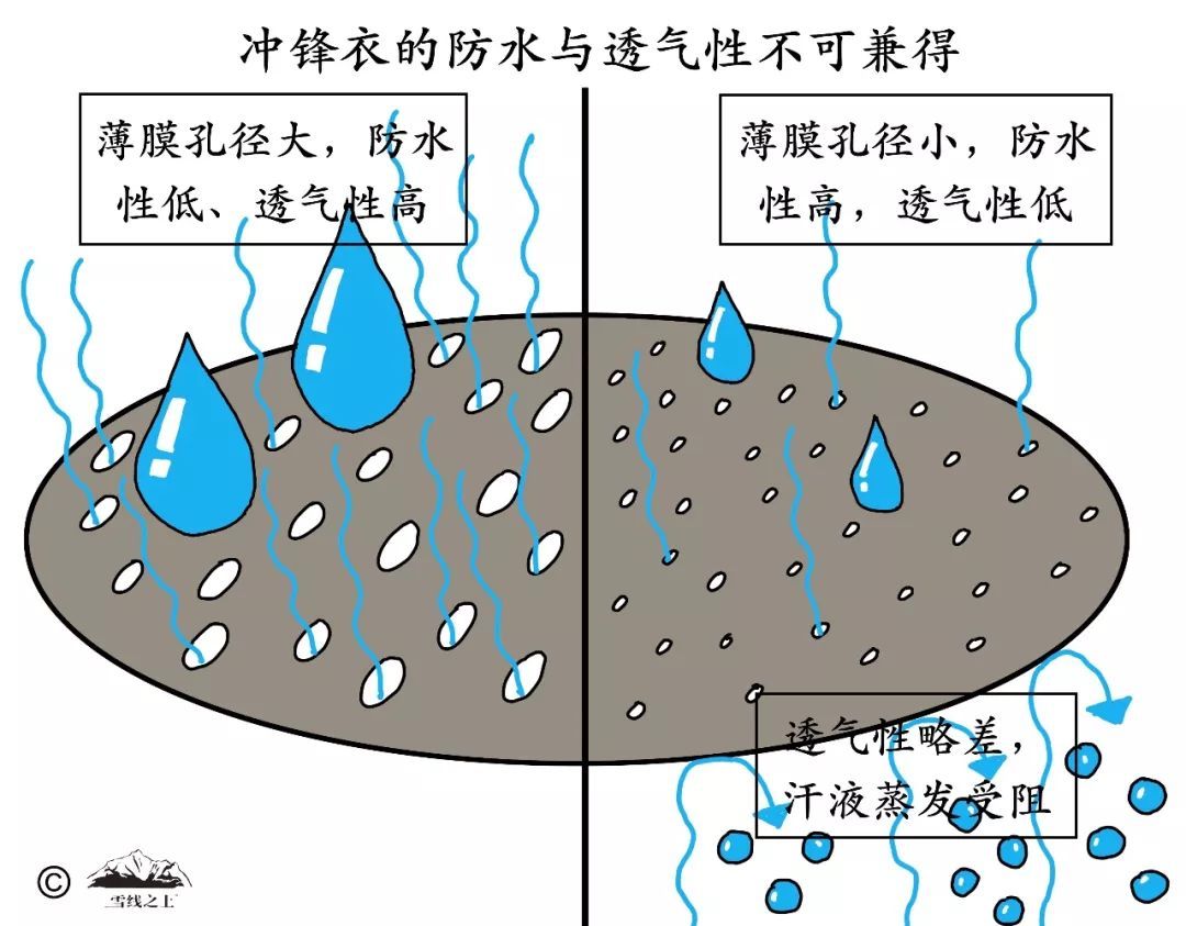 防水性越高,透氣性越弱——這是因?yàn)闆_鋒衣的防水和透氣都是利用同一通道——薄膜微孔。在厚此薄彼之間就造就了兩者之間的矛盾:提高防水性,就需要讓薄膜微孔更小、更密,就越不利于汗水蒸發(fā)排出。因此,沖鋒衣的防水性越高,透氣性越弱,反之亦然。