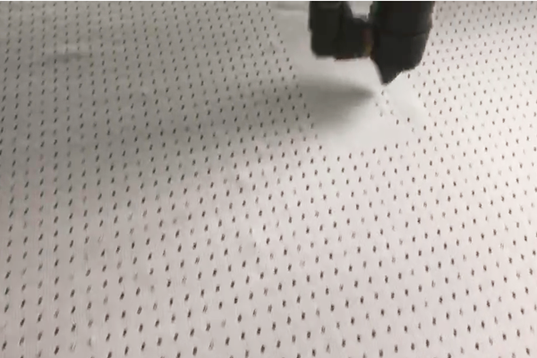 其實簡單來說鐳射就是激光,激光加工技術(shù)是利用激光束與物質(zhì)相互作用的特性對材料進行切割、表面處理、打孔、微加工等,識別物體等的一門技術(shù)。而且呢鐳射光束具有高亮度、高方向性、高單色性和高相干性四大特性,所以就給鐳射加工帶來一些其它加工方法所不具備的特性。又由于它是無接觸加工,對材料無直接沖擊,沒有機械變形;在鐳射加工過程中也無“刀具”磨損,無“切削力”,那您定制的沖鋒衣就能保持切割表面光潔美觀了;其次鐳射加工過程中,鐳射光束能量密度高,加工速度快,并且是局部加工,對非鐳射照射部位沒有影響或影響力極小。但是有的沖鋒衣的制作用鐳射機穿孔一個工序就要花上一個半多小時,可以看看下面的圖片,而且我們?yōu)榱吮WC沖鋒衣的質(zhì)量以免出錯還要專門派人看著,所以說一件沖鋒衣的制作工藝不簡單!