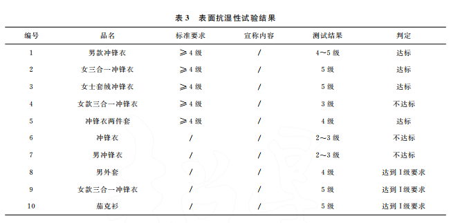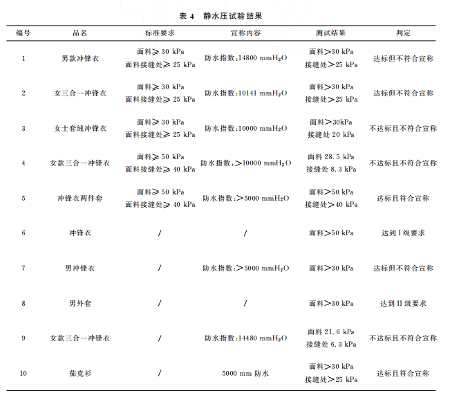 本文最終的判定是結(jié)合 GB/T32614—2016《戶外運(yùn)動(dòng)服裝 沖鋒衣》中面料功能性要求和產(chǎn)品銷售時(shí)的吊牌宣稱進(jìn)行。達(dá)標(biāo)是指符合沖鋒衣的合格品 標(biāo) 準(zhǔn) 要 求,反 之 則 不 符 合。10 件 樣 品中,只有5件達(dá)標(biāo),且只有3件是符合吊牌宣稱內(nèi)容。其中,標(biāo)示了 GB/T32614—2016的沖鋒衣,有3件達(dá)標(biāo),合格率為60%。近年來,監(jiān)管部門的抽查合格率一般在80%左右。這次比較試驗(yàn)合格率偏低的原因可能是樣品量較少,樣品的價(jià)格區(qū)間比較集中,且考核了接縫處的靜水壓。值得注意的是有2件沒有標(biāo)示 GB/T32614—2016的外套,其性能都符合標(biāo)準(zhǔn)要求。此外,銷售方對(duì)靜水壓的宣稱都偏高,有3件達(dá)標(biāo)了卻不符合自身的宣稱內(nèi)容。沖鋒衣 GB/T32614—2016標(biāo)準(zhǔn) 中 I級(jí) 對(duì) 靜 水 壓 的 要 求 也 只是:面料≥50kPa和面料接縫處≥50kPa,銷售 方卻往往宣稱100kPa,甚至達(dá)150kPa,而且也沒有充分考慮到面料接縫處?kù)o水壓值會(huì)相對(duì)偏小的現(xiàn)實(shí)。需要警 醒 的 是,5 件 標(biāo) 示 了 GB/T32614—2016的沖鋒衣其綜合宣傳都不符合規(guī)定,存在執(zhí)行標(biāo)準(zhǔn)標(biāo)注正確卻夸大宣傳的嫌疑。