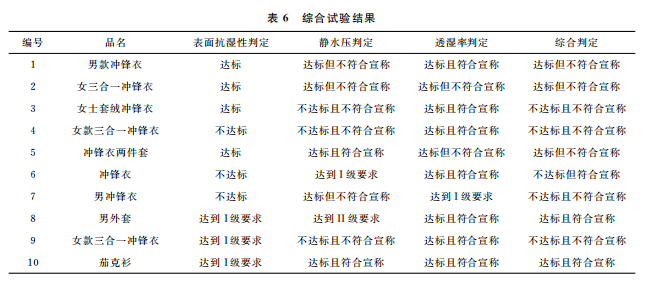表面抗?jié)裥浴㈧o水壓和透濕率綜合統(tǒng)計(jì)的測(cè)試結(jié)果見表6。