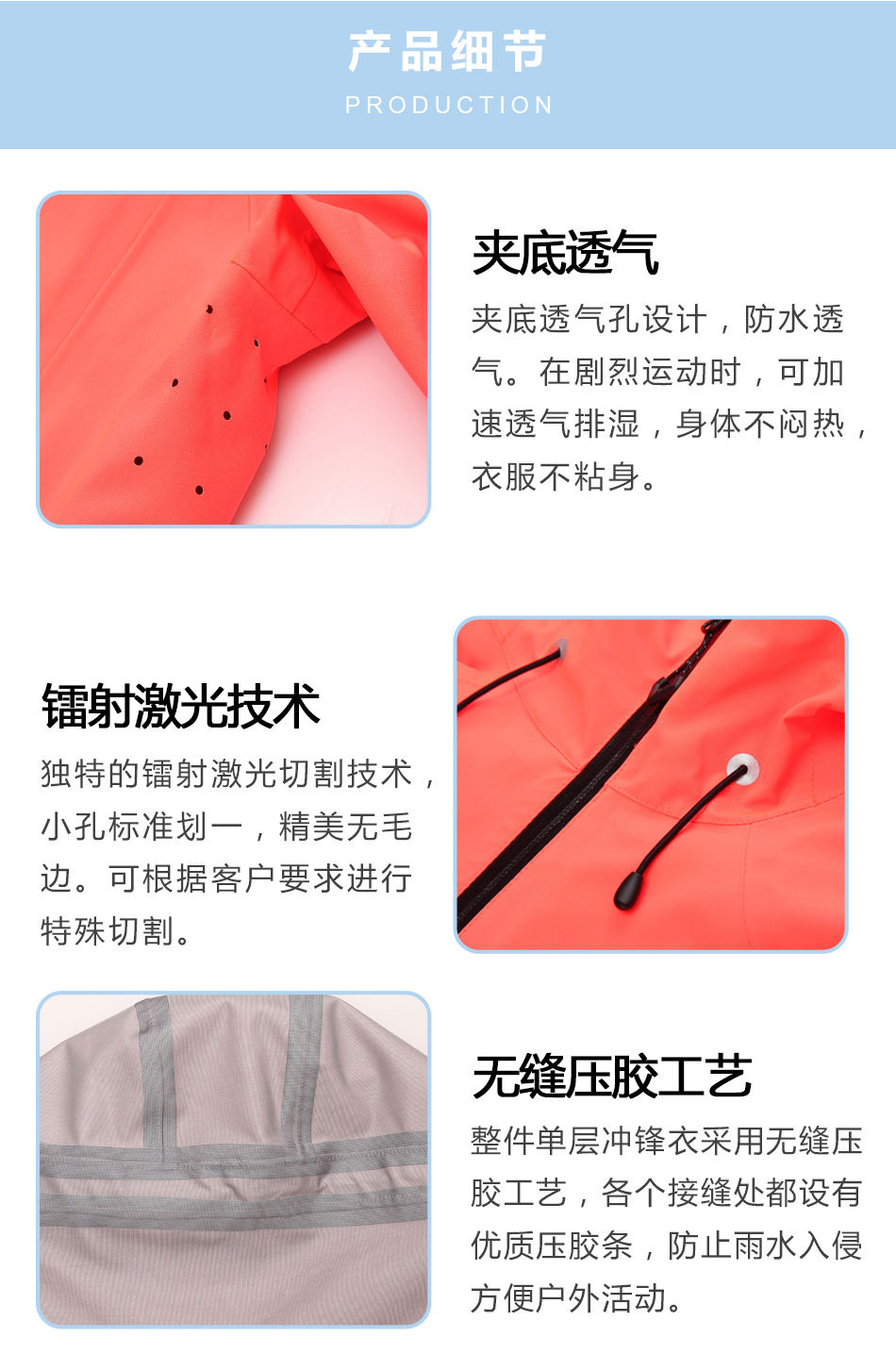 無縫壓膠工藝:整件單層壓膠沖鋒衣采用無縫壓膠工藝,各個接縫處都設有優(yōu)質(zhì)壓膠條,防止雨水入侵方便戶外活動。