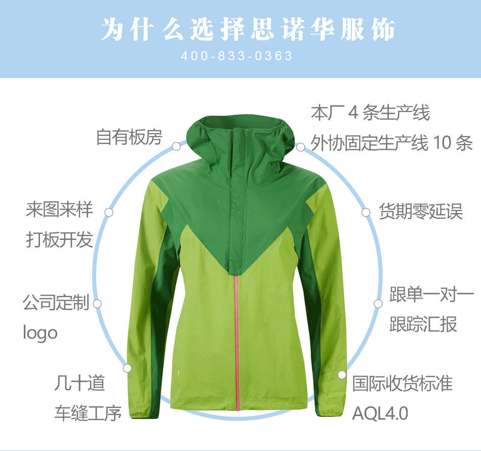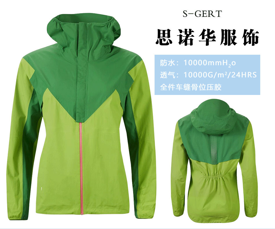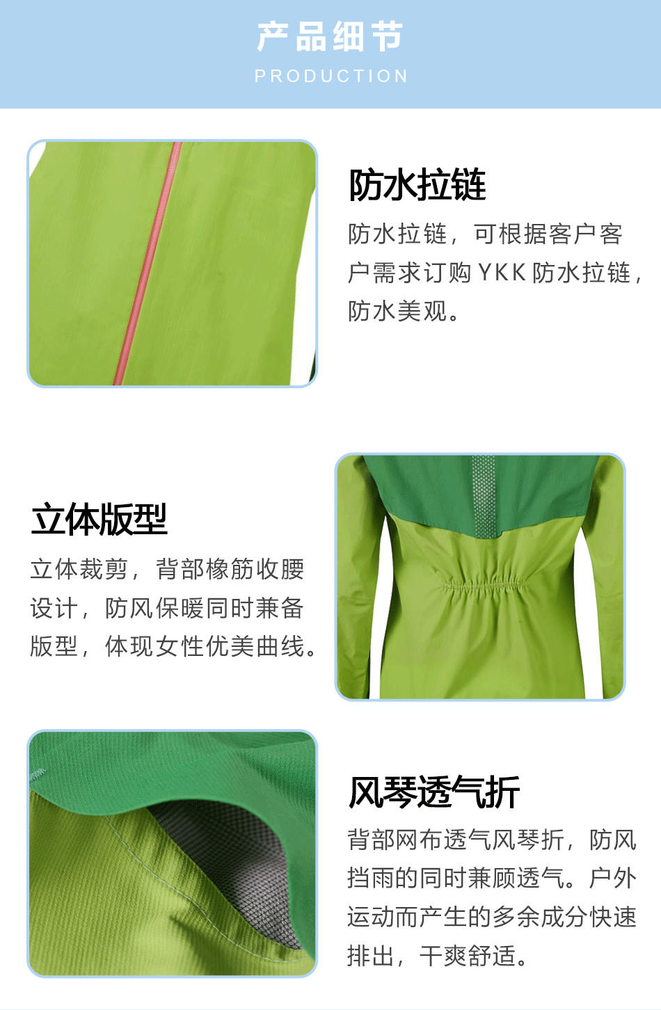立體版型:后背收腰設(shè)計(jì),立體裁剪,防風(fēng)保暖同時(shí)兼?zhèn)浒嫘?,體現(xiàn)女性優(yōu)美曲線,專業(yè)單層壓膠衣定制。