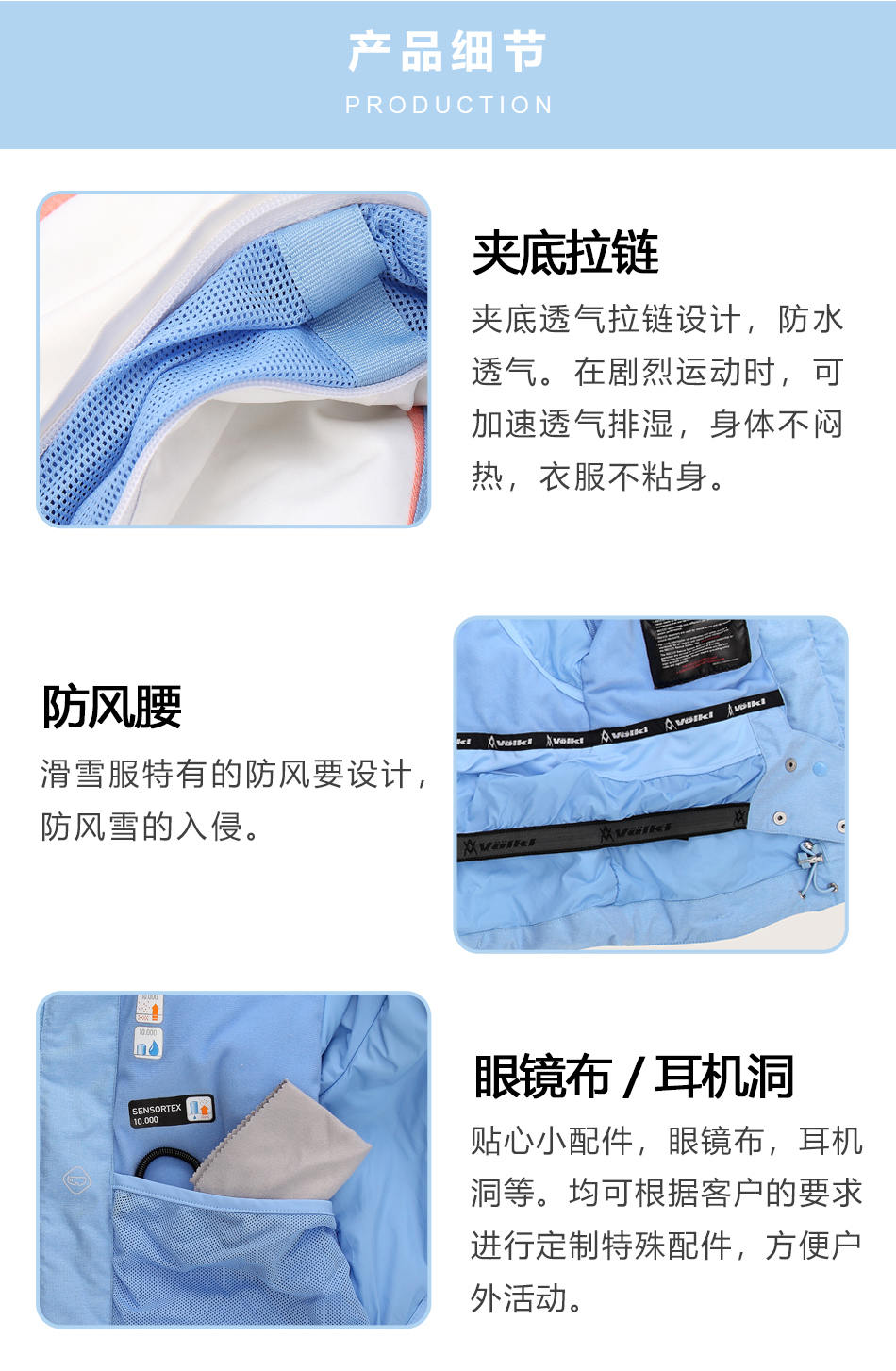 防水拉鏈采用無縫壓膠防水拉鏈激光熱封工藝貼合,面料采用進口防水透氣涂層膜,使防水透氣膜與面料完美結合。可根據(jù)客戶需求完成戶外沖鋒衣定制。