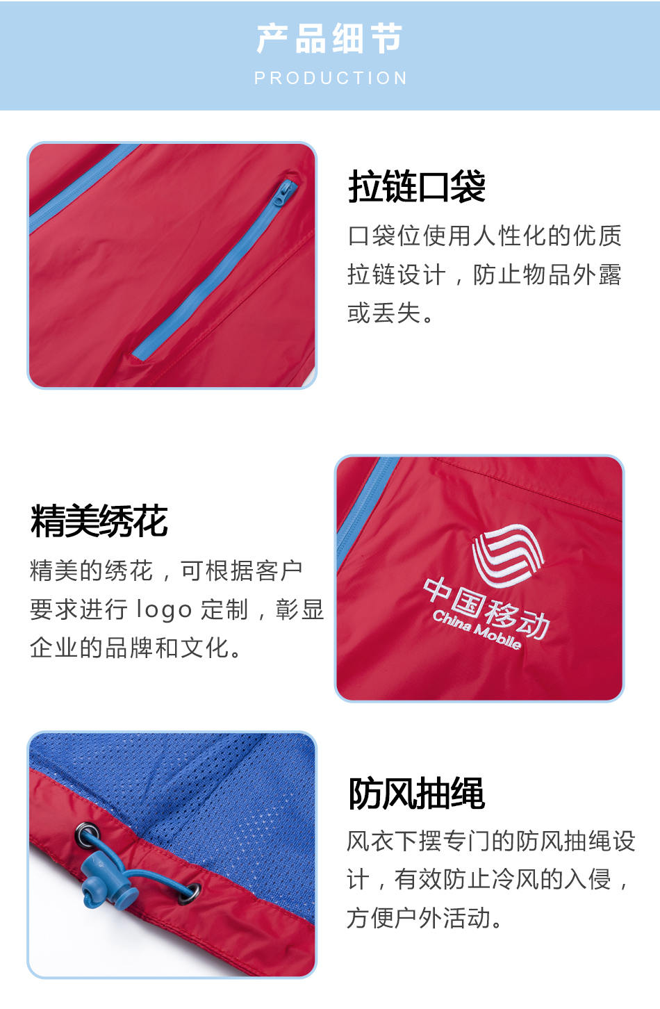 精美繡花:精美的繡花,可根據(jù)客戶要求單層風(fēng)衣定制的logo設(shè)計,彰顯企業(yè)的品牌和文化。