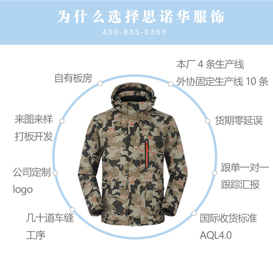 門襟設(shè)計(jì):滑雪服門襟處采用優(yōu)質(zhì)拉鏈與魔術(shù)貼結(jié)合,有效防止風(fēng)雪入侵,亦可根據(jù)客戶的要求進(jìn)行特殊保暖滑雪服加工。