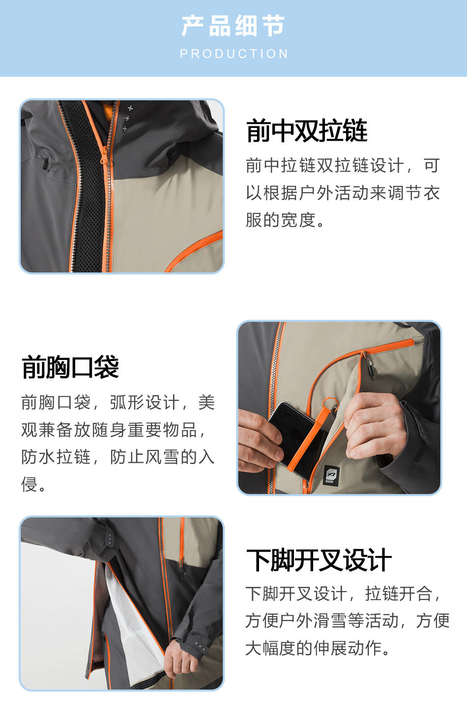 【下腳開(kāi)叉設(shè)計(jì)】拉鏈拉合,方便戶外滑雪等戶外活動(dòng)而需要的大幅度動(dòng)作