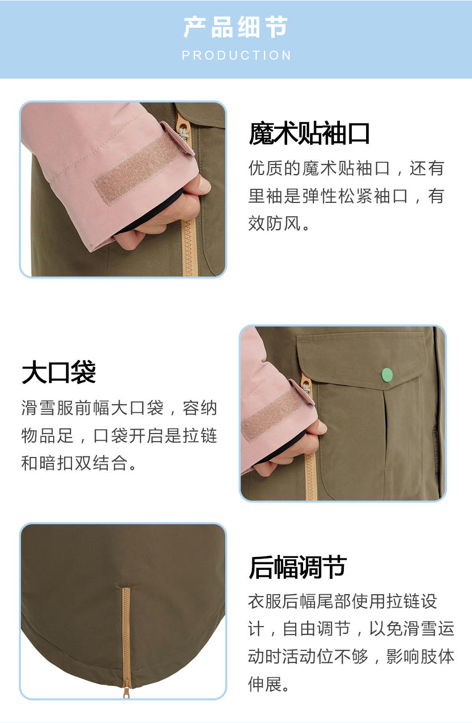大口袋:滑雪服前幅大口袋,容納物品足,口袋開啟是拉鏈和暗扣雙結合。