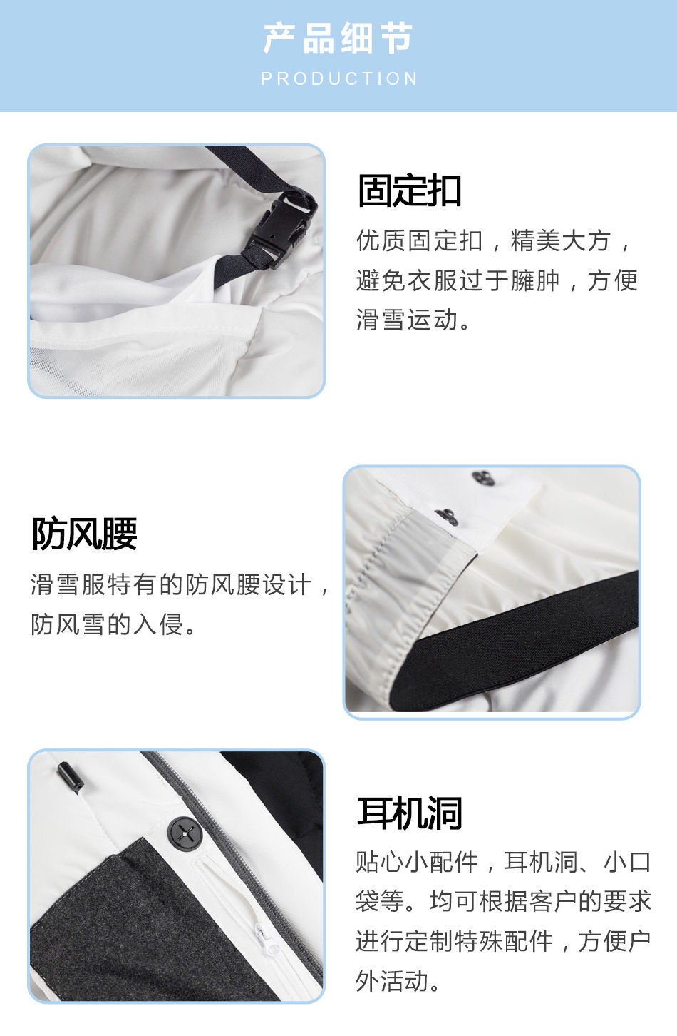 固定扣:優(yōu)質(zhì)固定扣,精美大方,避免衣服過于臃腫,方便滑雪運(yùn)動(dòng)。